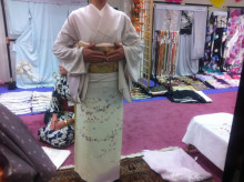 こちらのお客様は、踊りをなさっていて今回のイベントに立ち寄って頂きました。あまりに着物の着姿が素敵でしたので写真を撮らさせて頂きました。特に目を引いたのは、帯の結び方です。半巾帯の裏地を出して男性の角帯の結び方、「貝の口」の形で結んで帯〆をした着姿が粋で大変素敵でした。色々な工夫で自分らしさを表現して着物を楽しんで頂きたいと思いました。髪も素敵にまとめていました。