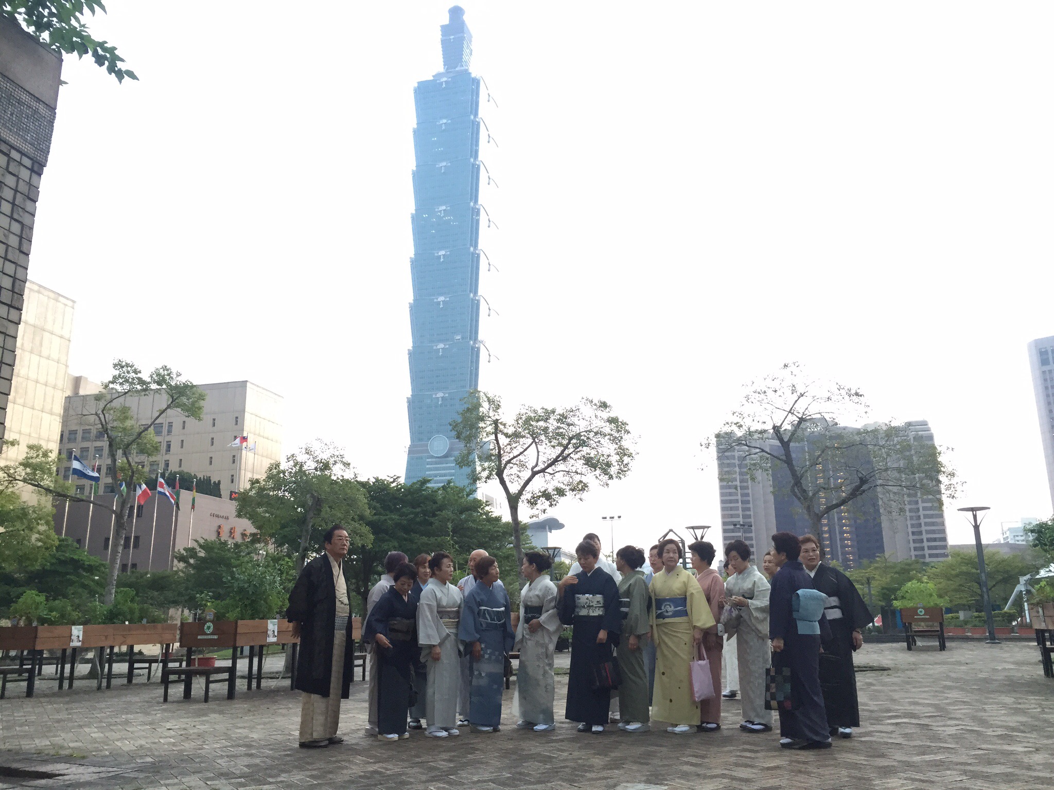 レストランに行く前に台北101がよく見える公園から着物姿で記念写真を撮りました。