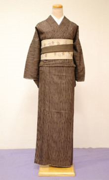 こちらの着物は、若い方、又は着物がビギナーの方にもオシャレで着やすい着物になっています。素材は、見た目は正絹の着物そっくりですが、ポリエステル100%の洗える仕立上りきものになっております。写真の細帯は、イメージです。