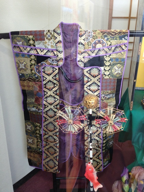 今回は、第一回越ヶ谷宿甲冑めぐりで東京きもの越谷店に飾られている陣羽織(仁乃覇織)と兜をご紹介させて頂きます。