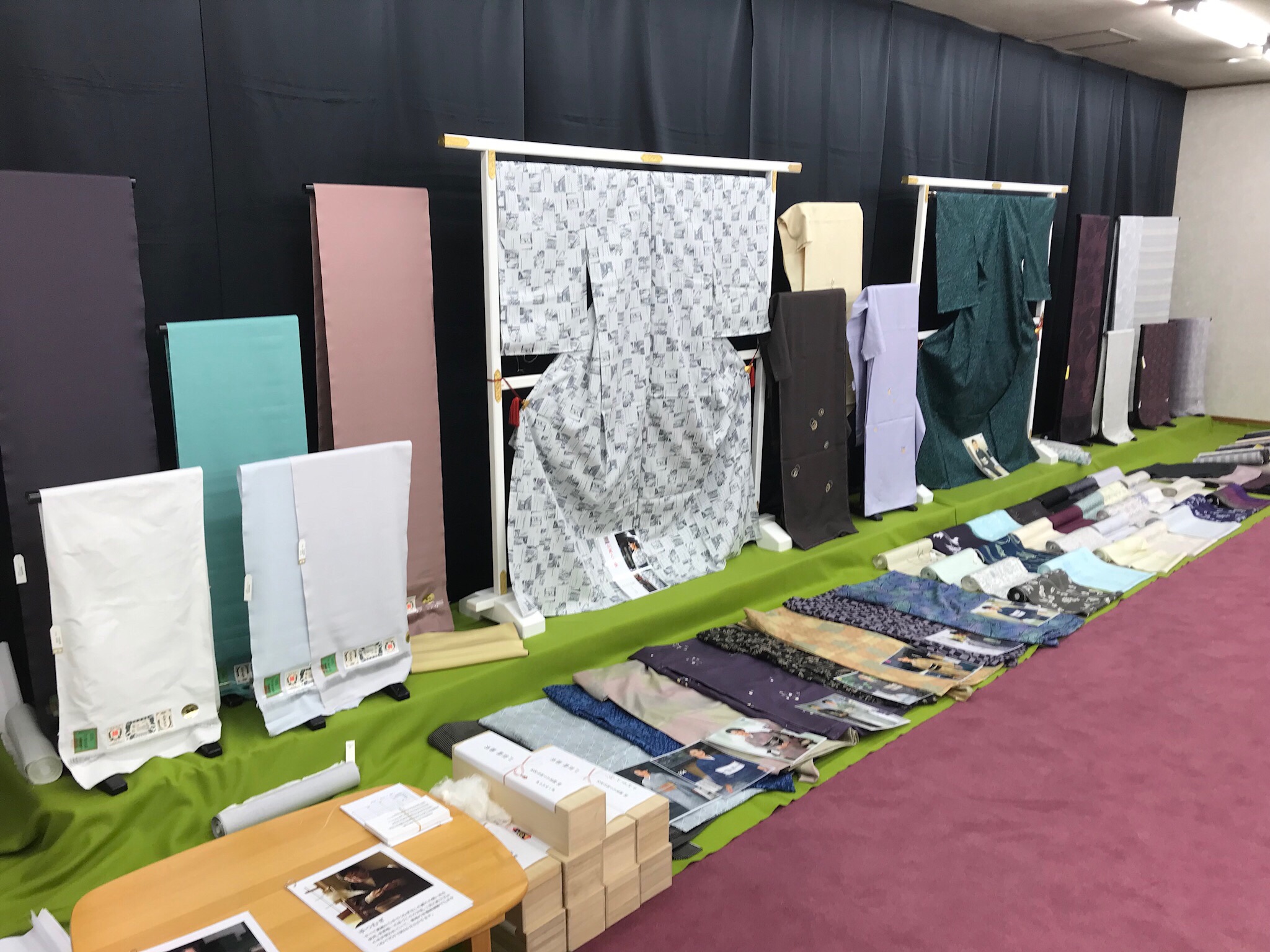こちらは、清左衛門のコーナーです。お召の着物で桃山時代の小袖を復元させた技術で着物を制作しています。非常に細かく、軽い着物ですべて織りで柄が表現されている着物です。お客様は大変喜んでいました。