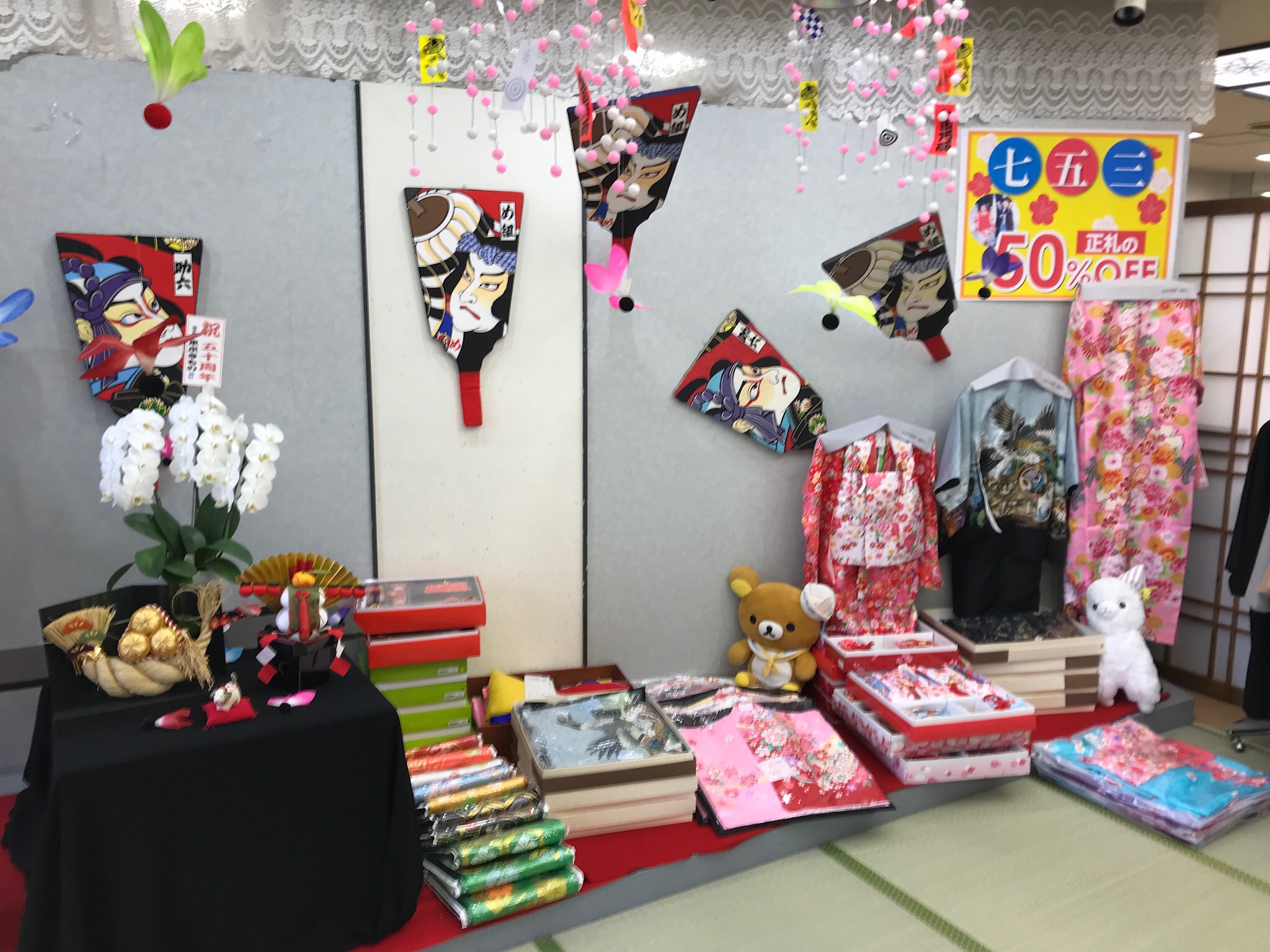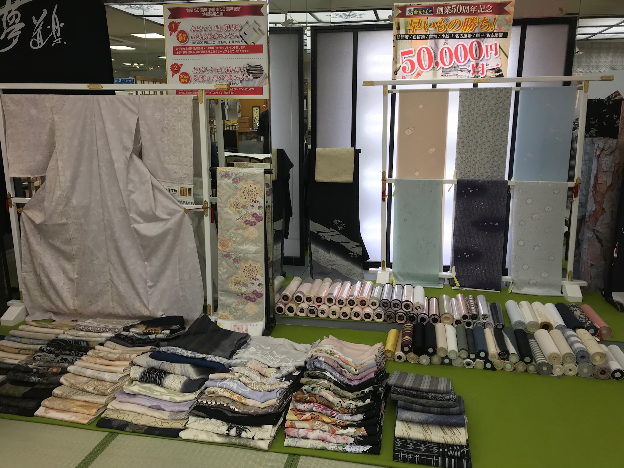 ありがとう「祝」50周年ということで、着物をお買い上げの方30名様に限り、正絹の長襦袢プレゼント、帯をお買い上げの方30名様に夢道楽の帯〆と帯揚げをプレゼントさせて頂きました。