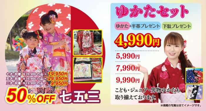 ゆかた、半帯、下駄をセットで特別価格でご用意しております!