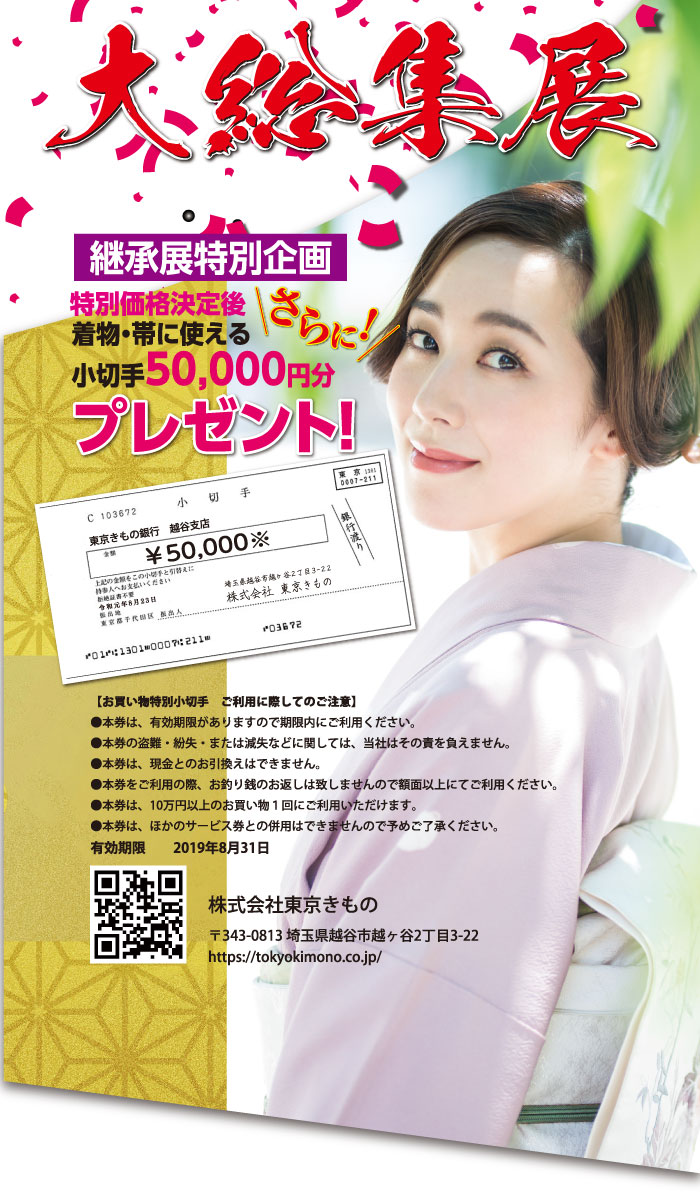 継承展特別企画 特別価格決定後、さらに着物・帯に使える小切手50,000円分プレゼント!