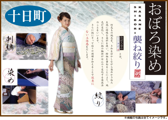 何色もの地色を、きわをぼかしながら染めかさねた生地に特殊な染料を使い、絵柄を重ねることにより、地色が変色し、さらに柄の輪郭がほんのり変化する染技法のことをいいます。